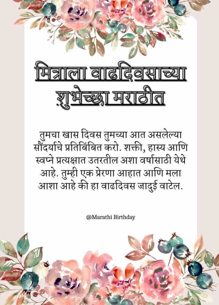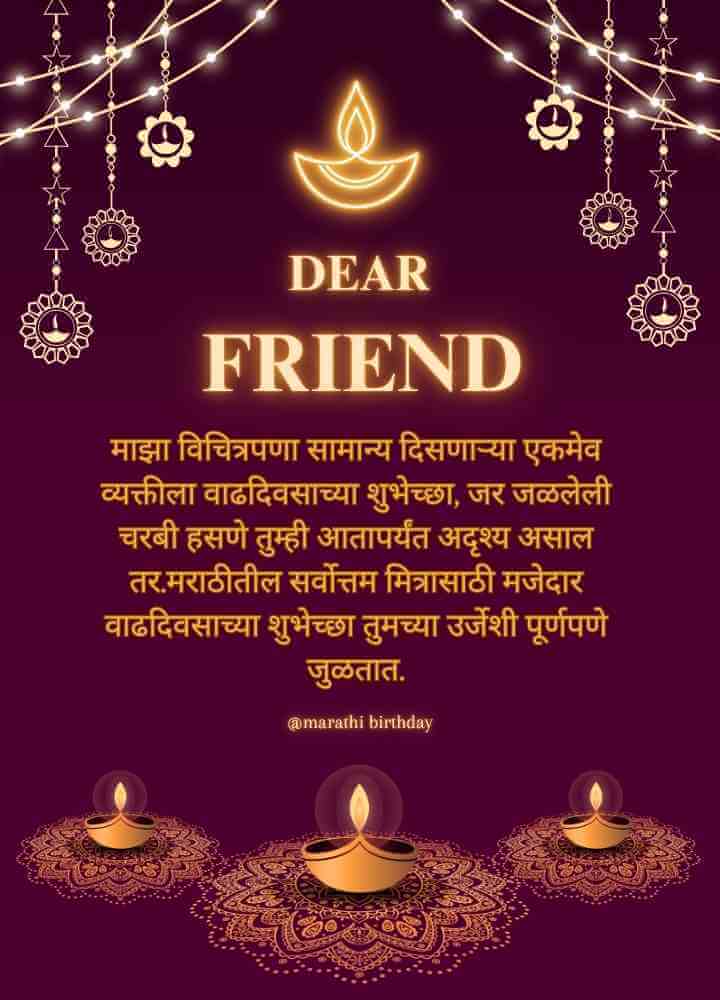 मित्राच्या वाढदिवसाच्या मराठी भाषेत शुभेच्छा ज्याच्या हास्याने सर्व काही ठीक होते. आजचा दिवस तुम्हाला सांत्वनाने भरून काढो आणि या वर्षी तुम्ही ज्या भेटवस्तूंची वाट पाहत आहात त्या तुम्हाला खंबीर संयमाने मिळोत. तुमचा उत्साही आत्मा अविश्वसनीयपणे नैसर्गिकरित्या पसरतो.
