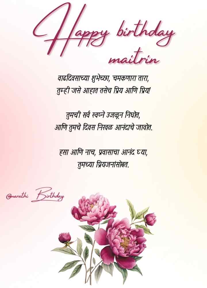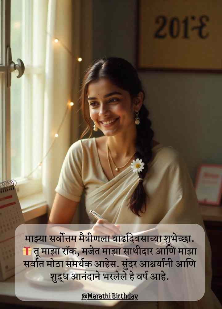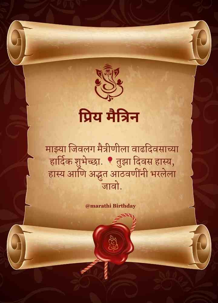 माझ्या जिवलग मैत्रिणीला वाढदिवसाच्या शुभेच्छा. 🌟 तुमची मैत्री ही खरी आशीर्वाद आहे. तुमचा दिवस तुमच्याइतकाच अद्भुत जावो.