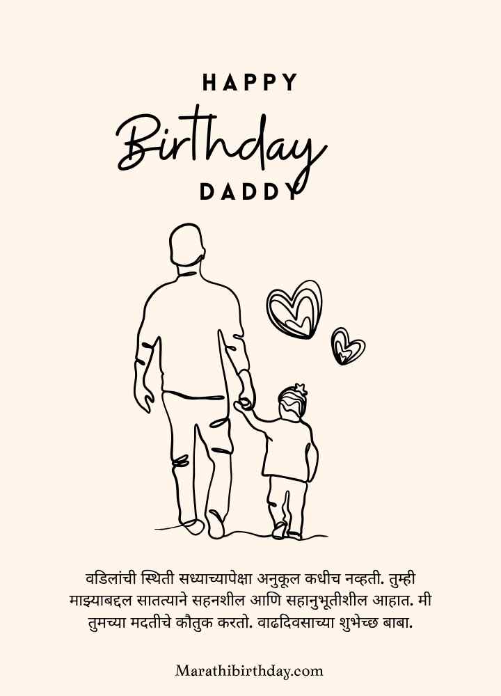 तुम्हाला वाढदिवसाच्या खूप खूप शुभेच्छा बाबा आज मी तुमची आणि तुम्ही मला तयार केलेल्या सर्व गोष्टींचे स्मरण करतो. तुमच्या प्रामाणिकपणाबद्दल आणि मी जो आहे तो मला सक्षम केल्याबद्दल मी कृतज्ञ आहे. तुझ्याबद्दलची माझी ओढ व्यक्त करण्यासाठी शब्द अपुरे आहेत. तुम्हाला पुढील वर्षासाठी खूप शुभेच्छा!