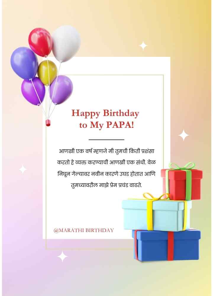 वडील मी तुम्हाला वाढदिवसाच्या खूप खूप शुभेच्छा देतो आम्ही आशा करतो की हा वाढदिवस तुम्हाला आयुष्यभर प्रे आनंद आणि आनंद देईल.